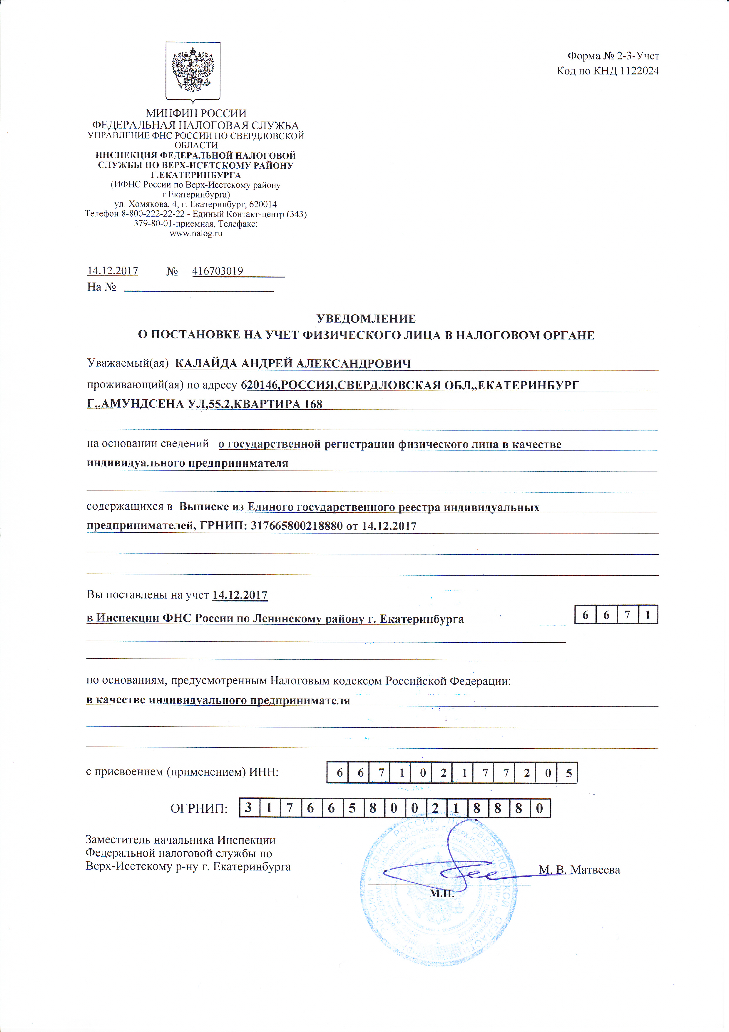 Уведомление о постановке на учёт в налоговой / ИП Калайда А.А.